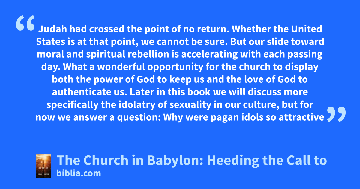 Judah had crossed the point of no return. Whether the United States is at that point, we cannot be sure. But our slide toward moral and spiritual rebellion is accelerating with each passing day. What a wonderful opportunity for the church to display both the power of God to keep us and the love of God to authenticate us. Later in this book we will discuss more specifically the idolatry of sexuality in our culture, but for now we answer a question: Why were pagan idols so attractive
