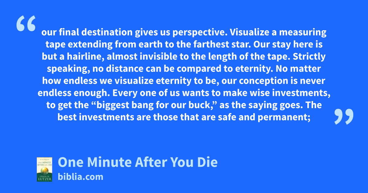 our final destination gives us perspective. Visualize a measuring tape extending from earth to the farthest star. Our stay here is but a hairline, almost invisible to the length of the tape. Strictly speaking, no distance can be compared to eternity. No matter how endless we visualize eternity to be, our conception is never endless enough. Every one of us wants to make wise investments, to get the “biggest bang for our buck,” as the saying goes. The best investments are those that are safe and permanent;