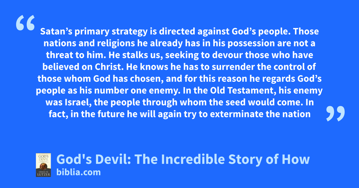 Satan’s primary strategy is directed against God’s people. Those nations and religions he already has in his possession are not a threat to him. He stalks us, seeking to devour those who have believed on Christ. He knows he has to surrender the control of those whom God has chosen, and for this reason he regards God’s people as his number one enemy. In the Old Testament, his enemy was Israel, the people through whom the seed would come. In fact, in the future he will again try to exterminate the nation