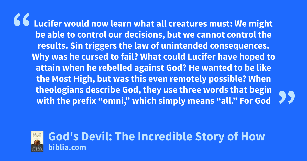 Lucifer would now learn what all creatures must: We might be able to control our decisions, but we cannot control the results. Sin triggers the law of unintended consequences. Why was he cursed to fail? What could Lucifer have hoped to attain when he rebelled against God? He wanted to be like the Most High, but was this even remotely possible? When theologians describe God, they use three words that begin with the prefix “omni,” which simply means “all.” For God