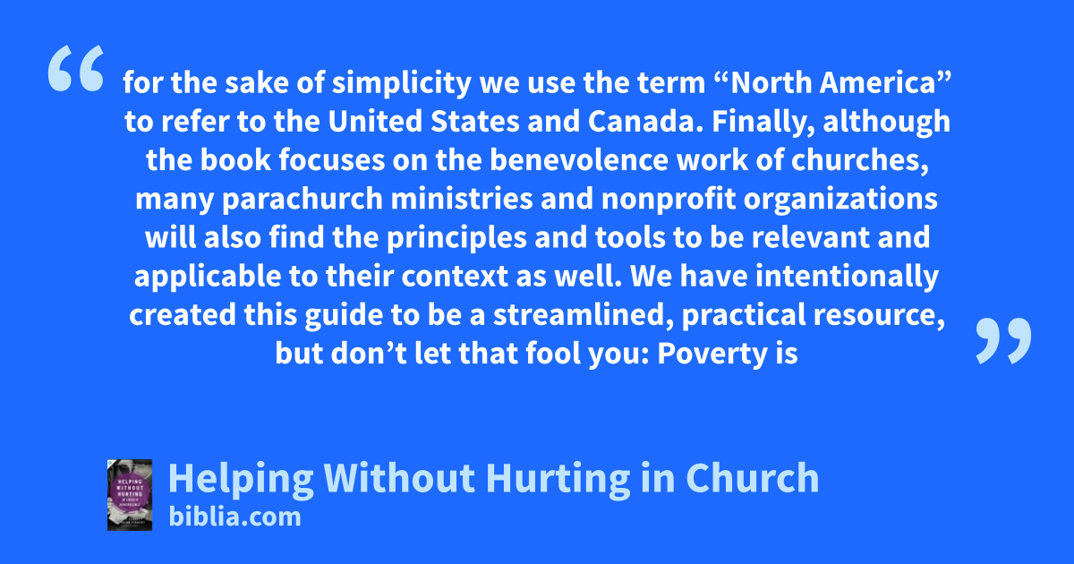for the sake of simplicity we use the term “North America” to refer to the United States and Canada. Finally, although the book focuses on the benevolence work of churches, many parachurch ministries and nonprofit organizations will also find the principles and tools to be relevant and applicable to their context as well. We have intentionally created this guide to be a streamlined, practical resource, but don’t let that fool you: Poverty is