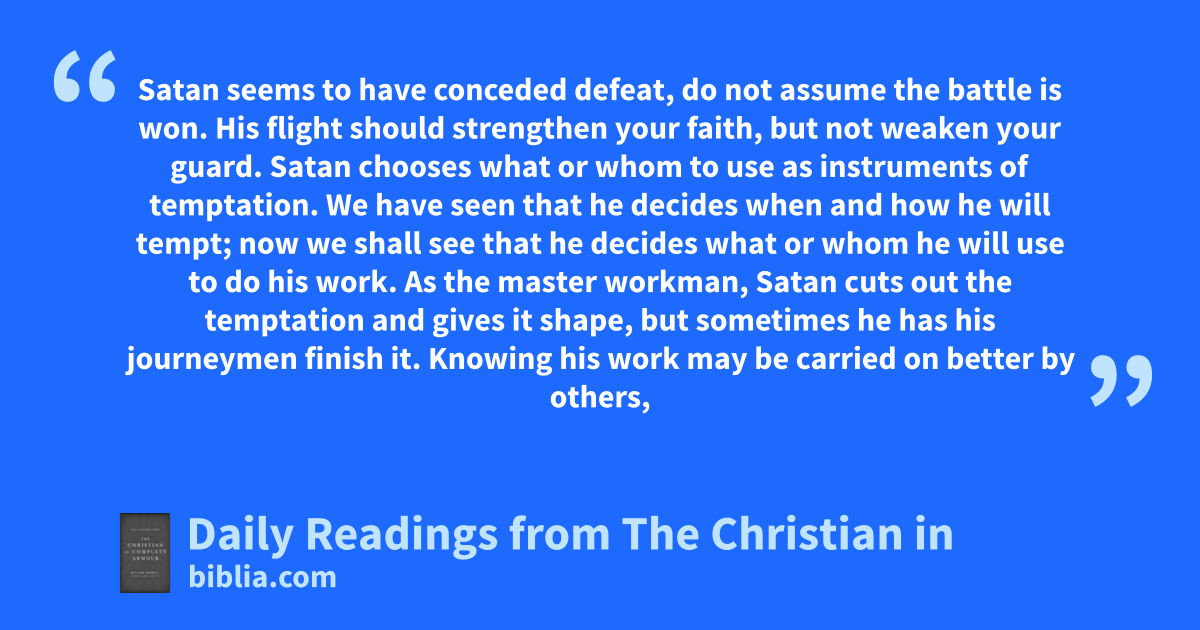 Satan seems to have conceded defeat, do not assume the battle is won. His flight should strengthen your faith, but not weaken your guard. Satan chooses what or whom to use as instruments of temptation. We have seen that he decides when and how he will tempt; now we shall see that he decides what or whom he will use to do his work. As the master workman, Satan cuts out the temptation and gives it shape, but sometimes he has his journeymen finish it. Knowing his work may be carried on better by others,