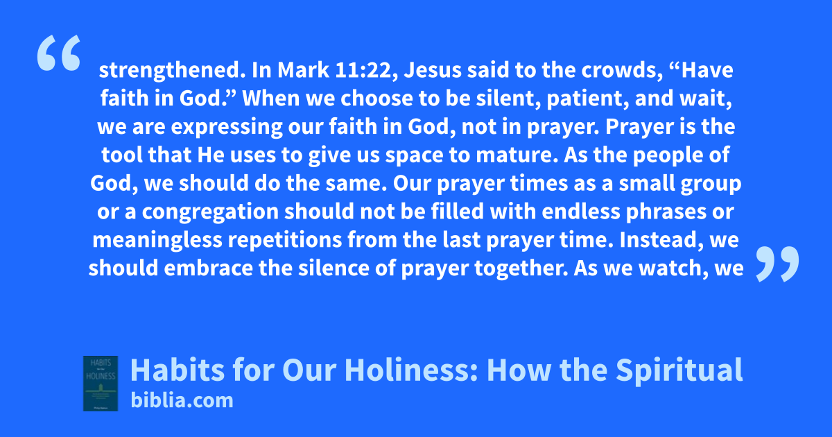strengthened. In Mark 11:22, Jesus said to the crowds, “Have faith in God.” When we choose to be silent, patient, and wait, we are expressing our faith in God, not in prayer. Prayer is the tool that He uses to give us space to mature. As the people of God, we should do the same. Our prayer times as a small group or a congregation should not be filled with endless phrases or meaningless repetitions from the last prayer time. Instead, we should embrace the silence of prayer together. As we watch, we
