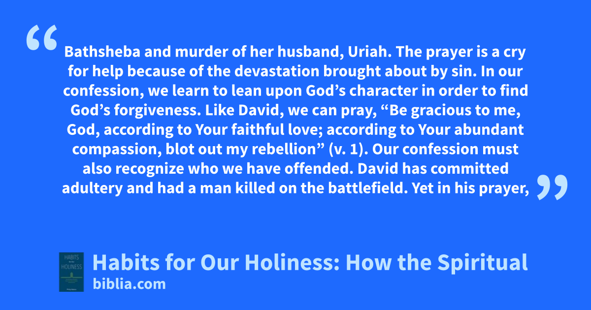 Bathsheba and murder of her husband, Uriah. The prayer is a cry for help because of the devastation brought about by sin. In our confession, we learn to lean upon God’s character in order to find God’s forgiveness. Like David, we can pray, “Be gracious to me, God, according to Your faithful love; according to Your abundant compassion, blot out my rebellion” (v. 1). Our confession must also recognize who we have offended. David has committed adultery and had a man killed on the battlefield. Yet in his prayer,