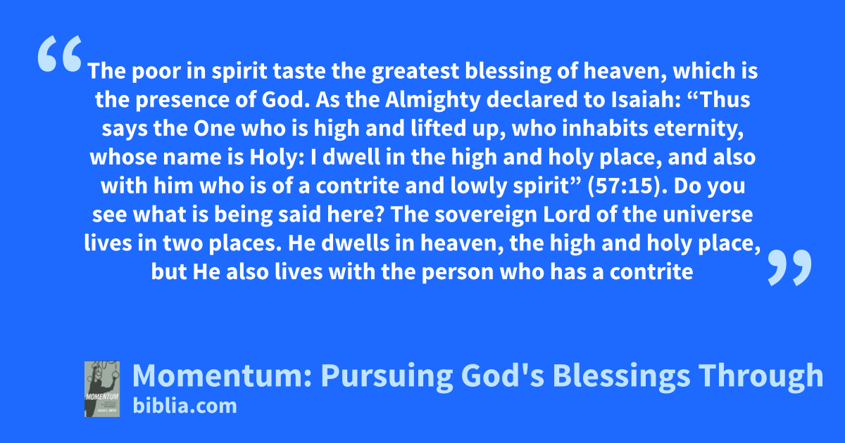 The poor in spirit taste the greatest blessing of heaven, which is the presence of God. As the Almighty declared to Isaiah: “Thus says the One who is high and lifted up, who inhabits eternity, whose name is Holy: I dwell in the high and holy place, and also with him who is of a contrite and lowly spirit” (57:15). Do you see what is being said here? The sovereign Lord of the universe lives in two places. He dwells in heaven, the high and holy place, but He also lives with the person who has a contrite