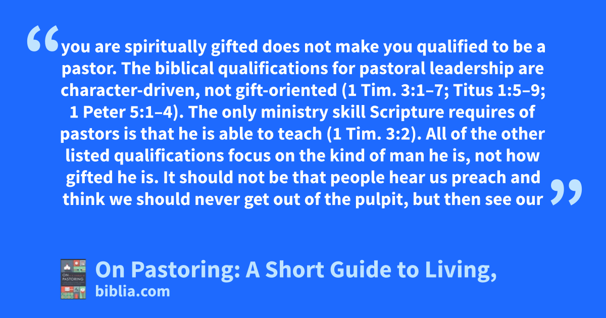 you are spiritually gifted does not make you qualified to be a pastor. The biblical qualifications for pastoral leadership are character-driven, not gift-oriented (1 Tim. 3:1–7; Titus 1:5–9; 1 Peter 5:1–4). The only ministry skill Scripture requires of pastors is that he is able to teach (1 Tim. 3:2). All of the other listed qualifications focus on the kind of man he is, not how gifted he is. It should not be that people hear us preach and think we should never get out of the pulpit, but then see our