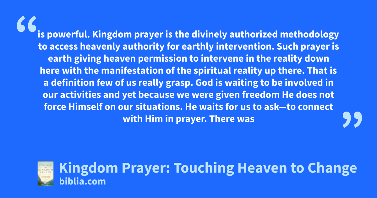 is powerful. Kingdom prayer is the divinely authorized methodology to access heavenly authority for earthly intervention. Such prayer is earth giving heaven permission to intervene in the reality down here with the manifestation of the spiritual reality up there. That is a definition few of us really grasp. God is waiting to be involved in our activities and yet because we were given freedom He does not force Himself on our situations. He waits for us to ask—to connect with Him in prayer. There was