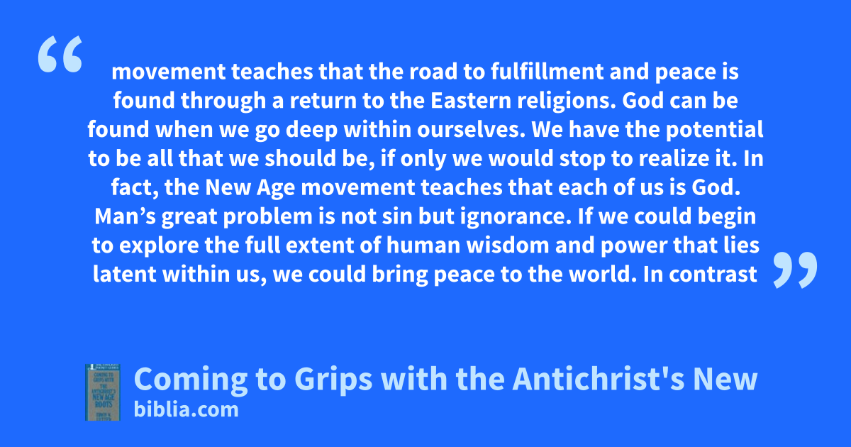 movement teaches that the road to fulfillment and peace is found through a return to the Eastern religions. God can be found when we go deep within ourselves. We have the potential to be all that we should be, if only we would stop to realize it. In fact, the New Age movement teaches that each of us is God. Man’s great problem is not sin but ignorance. If we could begin to explore the full extent of human wisdom and power that lies latent within us, we could bring peace to the world. In contrast