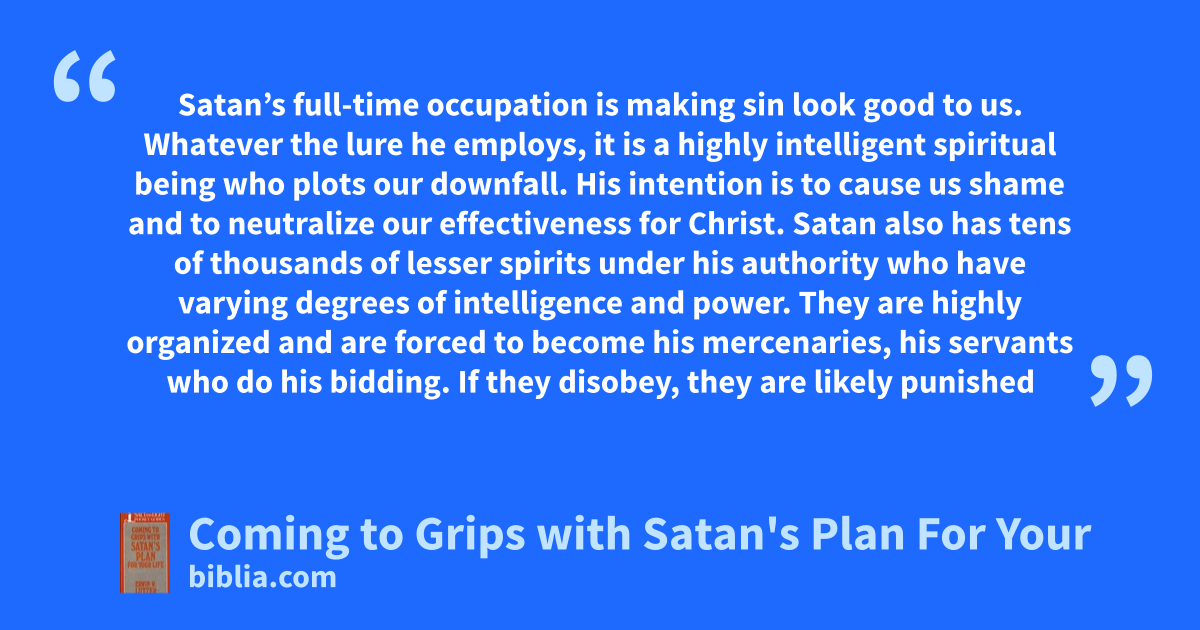 Satan’s full-time occupation is making sin look good to us. Whatever the lure he employs, it is a highly intelligent spiritual being who plots our downfall. His intention is to cause us shame and to neutralize our effectiveness for Christ. Satan also has tens of thousands of lesser spirits under his authority who have varying degrees of intelligence and power. They are highly organized and are forced to become his mercenaries, his servants who do his bidding. If they disobey, they are likely punished