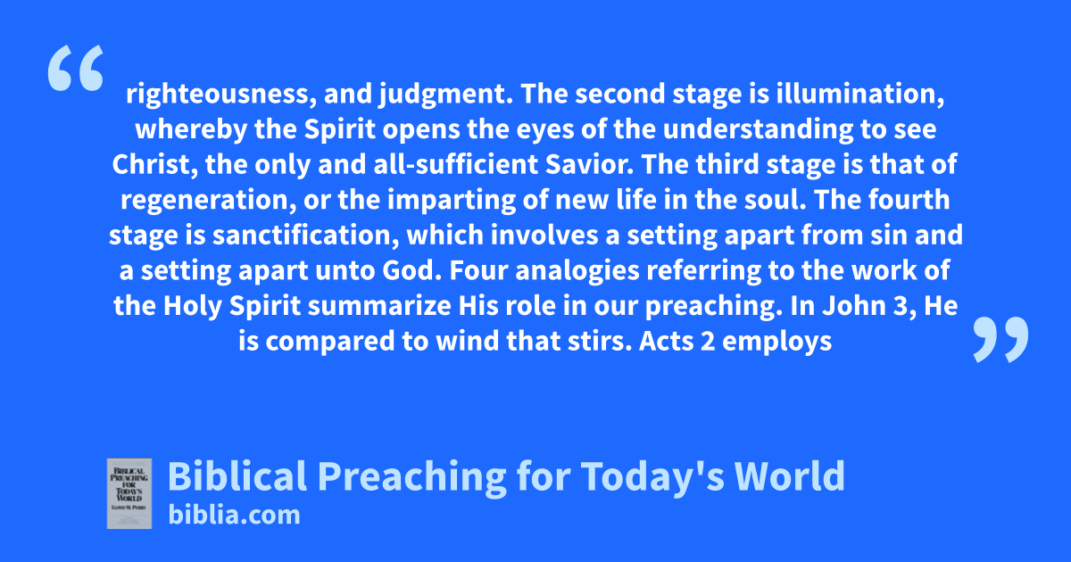 righteousness, and judgment. The second stage is illumination, whereby the Spirit opens the eyes of the understanding to see Christ, the only and all-sufficient Savior. The third stage is that of regeneration, or the imparting of new life in the soul. The fourth stage is sanctification, which involves a setting apart from sin and a setting apart unto God. Four analogies referring to the work of the Holy Spirit summarize His role in our preaching. In John 3, He is compared to wind that stirs. Acts 2 employs