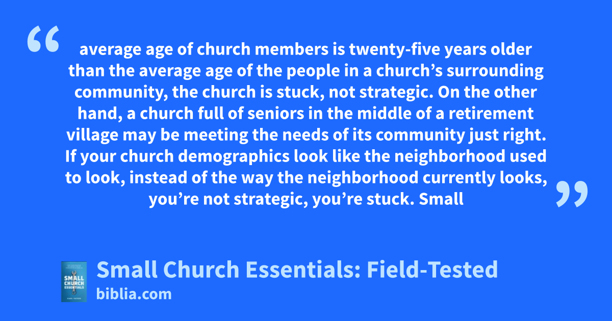 average age of church members is twenty-five years older than the average age of the people in a church’s surrounding community, the church is stuck, not strategic. On the other hand, a church full of seniors in the middle of a retirement village may be meeting the needs of its community just right. If your church demographics look like the neighborhood used to look, instead of the way the neighborhood currently looks, you’re not strategic, you’re stuck. Small