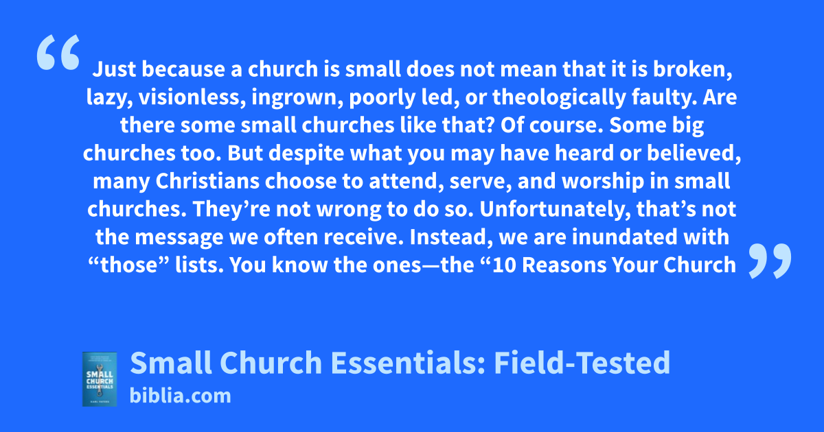 Just because a church is small does not mean that it is broken, lazy, visionless, ingrown, poorly led, or theologically faulty. Are there some small churches like that? Of course. Some big churches too. But despite what you may have heard or believed, many Christians choose to attend, serve, and worship in small churches. They’re not wrong to do so. Unfortunately, that’s not the message we often receive. Instead, we are inundated with “those” lists. You know the ones—the “10 Reasons Your Church