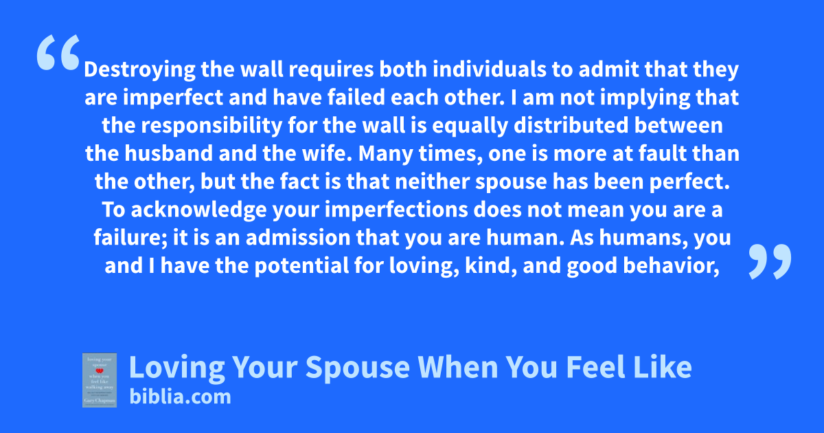 Destroying the wall requires both individuals to admit that they are imperfect and have failed each other. I am not implying that the responsibility for the wall is equally distributed between the husband and the wife. Many times, one is more at fault than the other, but the fact is that neither spouse has been perfect. To acknowledge your imperfections does not mean you are a failure; it is an admission that you are human. As humans, you and I have the potential for loving, kind, and good behavior,