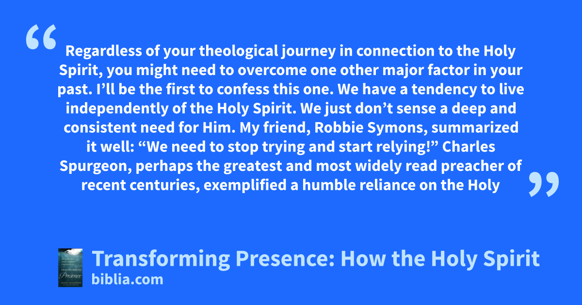 Regardless of your theological journey in connection to the Holy Spirit, you might need to overcome one other major factor in your past. I’ll be the first to confess this one. We have a tendency to live independently of the Holy Spirit. We just don’t sense a deep and consistent need for Him. My friend, Robbie Symons, summarized it well: “We need to stop trying and start relying!” Charles Spurgeon, perhaps the greatest and most widely read preacher of recent centuries, exemplified a humble reliance on the Holy