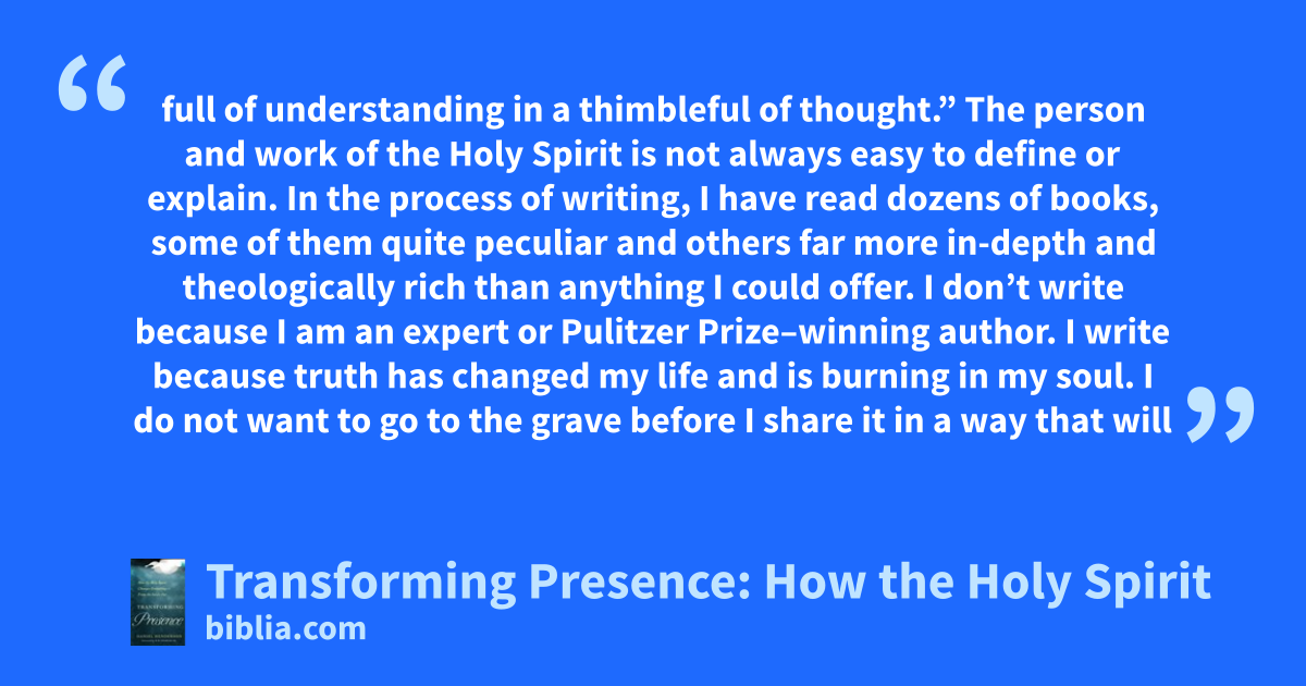 full of understanding in a thimbleful of thought.” The person and work of the Holy Spirit is not always easy to define or explain. In the process of writing, I have read dozens of books, some of them quite peculiar and others far more in-depth and theologically rich than anything I could offer. I don’t write because I am an expert or Pulitzer Prize–winning author. I write because truth has changed my life and is burning in my soul. I do not want to go to the grave before I share it in a way that will