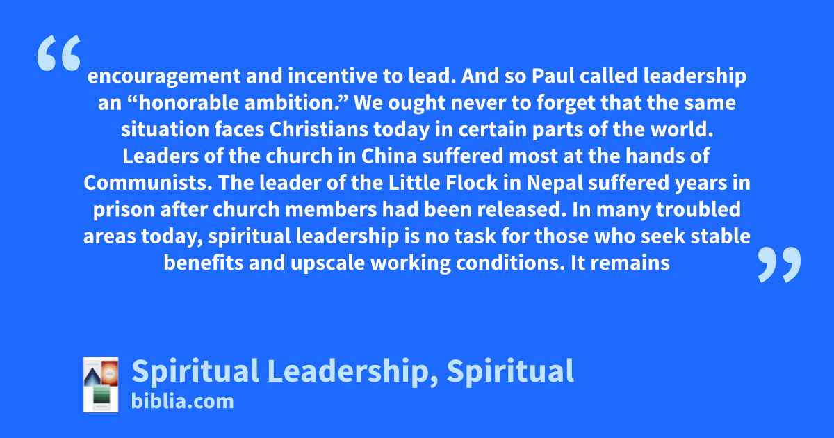 encouragement and incentive to lead. And so Paul called leadership an “honorable ambition.” We ought never to forget that the same situation faces Christians today in certain parts of the world. Leaders of the church in China suffered most at the hands of Communists. The leader of the Little Flock in Nepal suffered years in prison after church members had been released. In many troubled areas today, spiritual leadership is no task for those who seek stable benefits and upscale working conditions. It remains