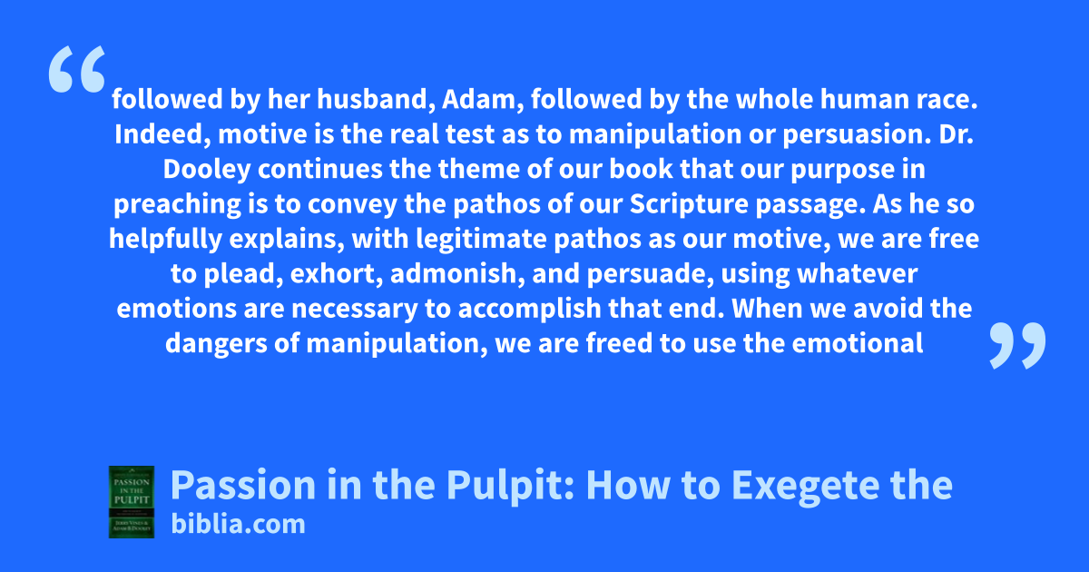 followed by her husband, Adam, followed by the whole human race. Indeed, motive is the real test as to manipulation or persuasion. Dr. Dooley continues the theme of our book that our purpose in preaching is to convey the pathos of our Scripture passage. As he so helpfully explains, with legitimate pathos as our motive, we are free to plead, exhort, admonish, and persuade, using whatever emotions are necessary to accomplish that end. When we avoid the dangers of manipulation, we are freed to use the emotional