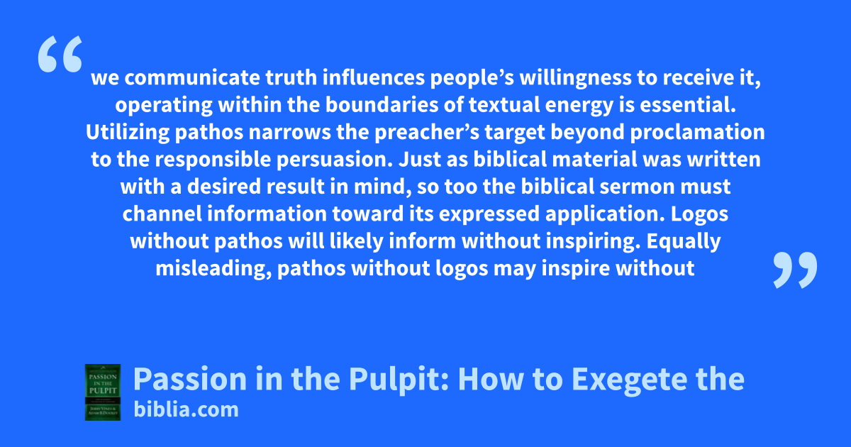 we communicate truth influences people’s willingness to receive it, operating within the boundaries of textual energy is essential. Utilizing pathos narrows the preacher’s target beyond proclamation to the responsible persuasion. Just as biblical material was written with a desired result in mind, so too the biblical sermon must channel information toward its expressed application. Logos without pathos will likely inform without inspiring. Equally misleading, pathos without logos may inspire without
