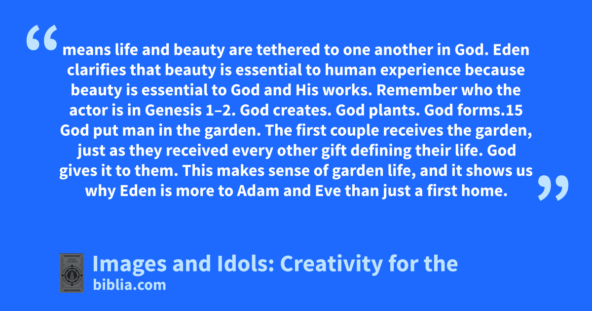 means life and beauty are tethered to one another in God. Eden clarifies that beauty is essential to human experience because beauty is essential to God and His works. Remember who the actor is in Genesis 1–2. God creates. God plants. God forms.15 God put man in the garden. The first couple receives the garden, just as they received every other gift defining their life. God gives it to them. This makes sense of garden life, and it shows us why Eden is more to Adam and Eve than just a first home.