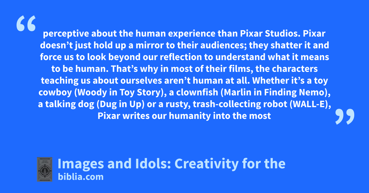 perceptive about the human experience than Pixar Studios. Pixar doesn’t just hold up a mirror to their audiences; they shatter it and force us to look beyond our reflection to understand what it means to be human. That’s why in most of their films, the characters teaching us about ourselves aren’t human at all. Whether it’s a toy cowboy (Woody in Toy Story), a clownfish (Marlin in Finding Nemo), a talking dog (Dug in Up) or a rusty, trash-collecting robot (WALL-E), Pixar writes our humanity into the most