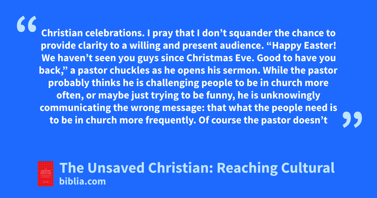 Christian celebrations. I pray that I don’t squander the chance to provide clarity to a willing and present audience. “Happy Easter! We haven’t seen you guys since Christmas Eve. Good to have you back,” a pastor chuckles as he opens his sermon. While the pastor probably thinks he is challenging people to be in church more often, or maybe just trying to be funny, he is unknowingly communicating the wrong message: that what the people need is to be in church more frequently. Of course the pastor doesn’t