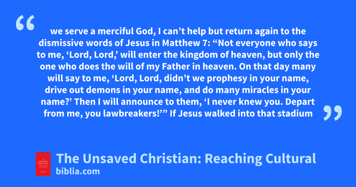 we serve a merciful God, I can’t help but return again to the dismissive words of Jesus in Matthew 7: “Not everyone who says to me, ‘Lord, Lord,’ will enter the kingdom of heaven, but only the one who does the will of my Father in heaven. On that day many will say to me, ‘Lord, Lord, didn’t we prophesy in your name, drive out demons in your name, and do many miracles in your name?’ Then I will announce to them, ‘I never knew you. Depart from me, you lawbreakers!’” If Jesus walked into that stadium