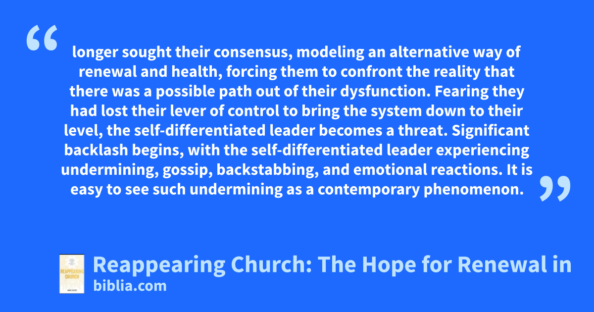 longer sought their consensus, modeling an alternative way of renewal and health, forcing them to confront the reality that there was a possible path out of their dysfunction. Fearing they had lost their lever of control to bring the system down to their level, the self-differentiated leader becomes a threat. Significant backlash begins, with the self-differentiated leader experiencing undermining, gossip, backstabbing, and emotional reactions. It is easy to see such undermining as a contemporary phenomenon.
