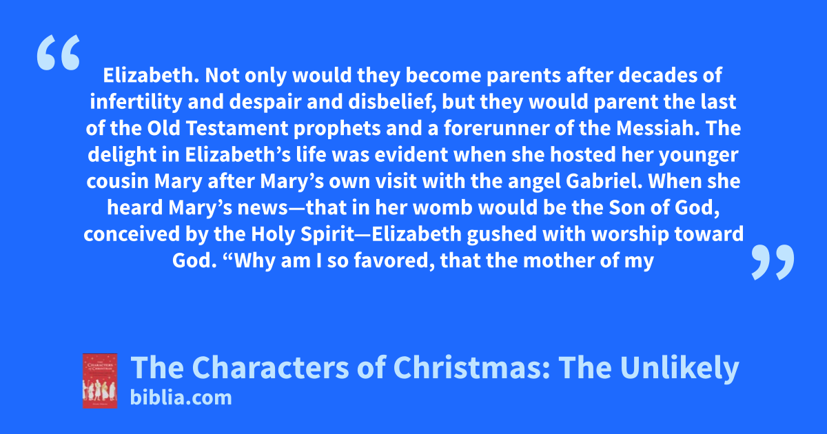 Elizabeth. Not only would they become parents after decades of infertility and despair and disbelief, but they would parent the last of the Old Testament prophets and a forerunner of the Messiah. The delight in Elizabeth’s life was evident when she hosted her younger cousin Mary after Mary’s own visit with the angel Gabriel. When she heard Mary’s news—that in her womb would be the Son of God, conceived by the Holy Spirit—Elizabeth gushed with worship toward God. “Why am I so favored, that the mother of my