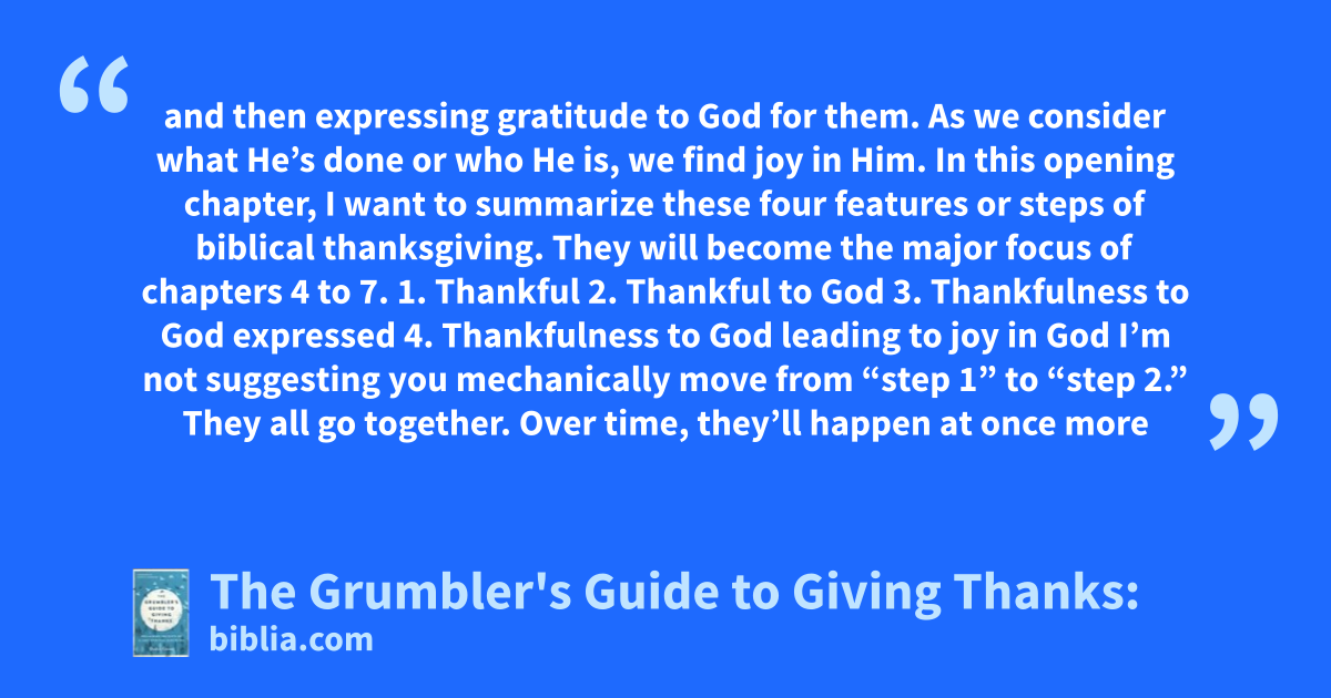 and then expressing gratitude to God for them. As we consider what He’s done or who He is, we find joy in Him. In this opening chapter, I want to summarize these four features or steps of biblical thanksgiving. They will become the major focus of chapters 4 to 7. 1. Thankful 2. Thankful to God 3. Thankfulness to God expressed 4. Thankfulness to God leading to joy in God I’m not suggesting you mechanically move from “step 1” to “step 2.” They all go together. Over time, they’ll happen at once more