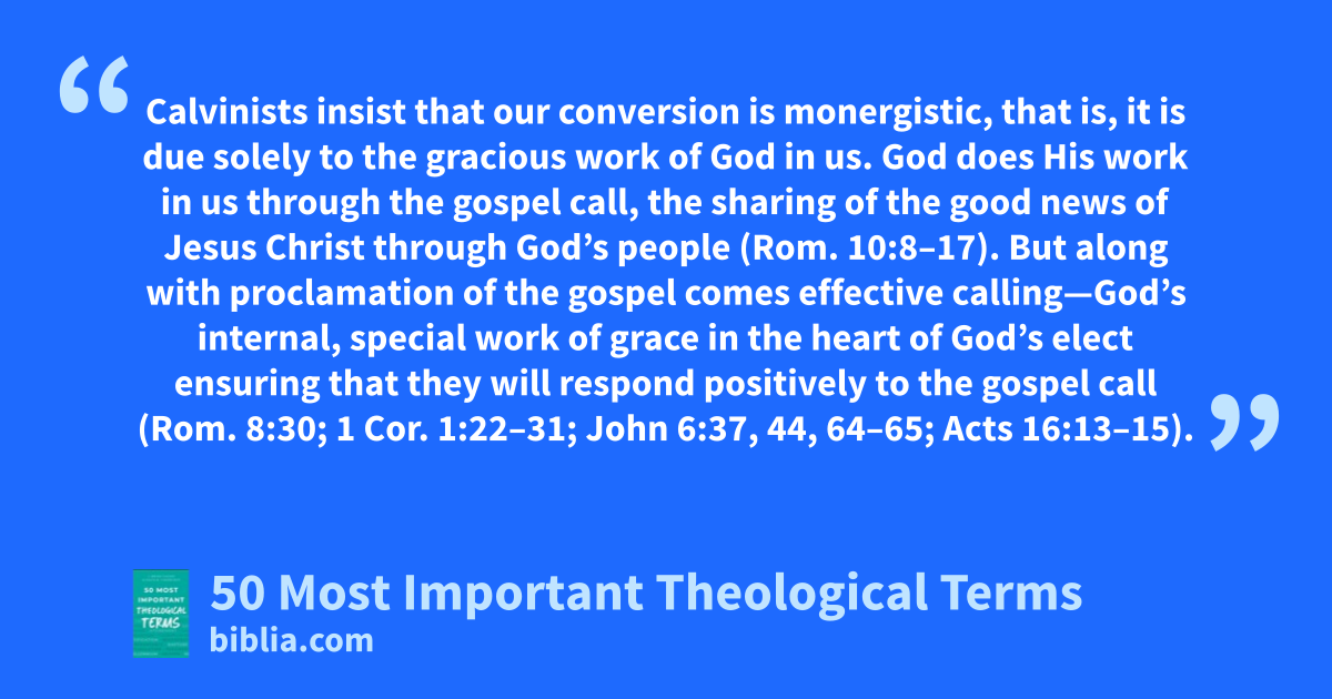 Calvinists insist that our conversion is monergistic, that is, it is due solely to the gracious work of God in us. God does His work in us through the gospel call, the sharing of the good news of Jesus Christ through God’s people (Rom. 10:8–17). But along with proclamation of the gospel comes effective calling—God’s internal, special work of grace in the heart of God’s elect ensuring that they will respond positively to the gospel call (Rom. 8:30; 1 Cor. 1:22–31; John 6:37, 44, 64–65; Acts 16:13–15).