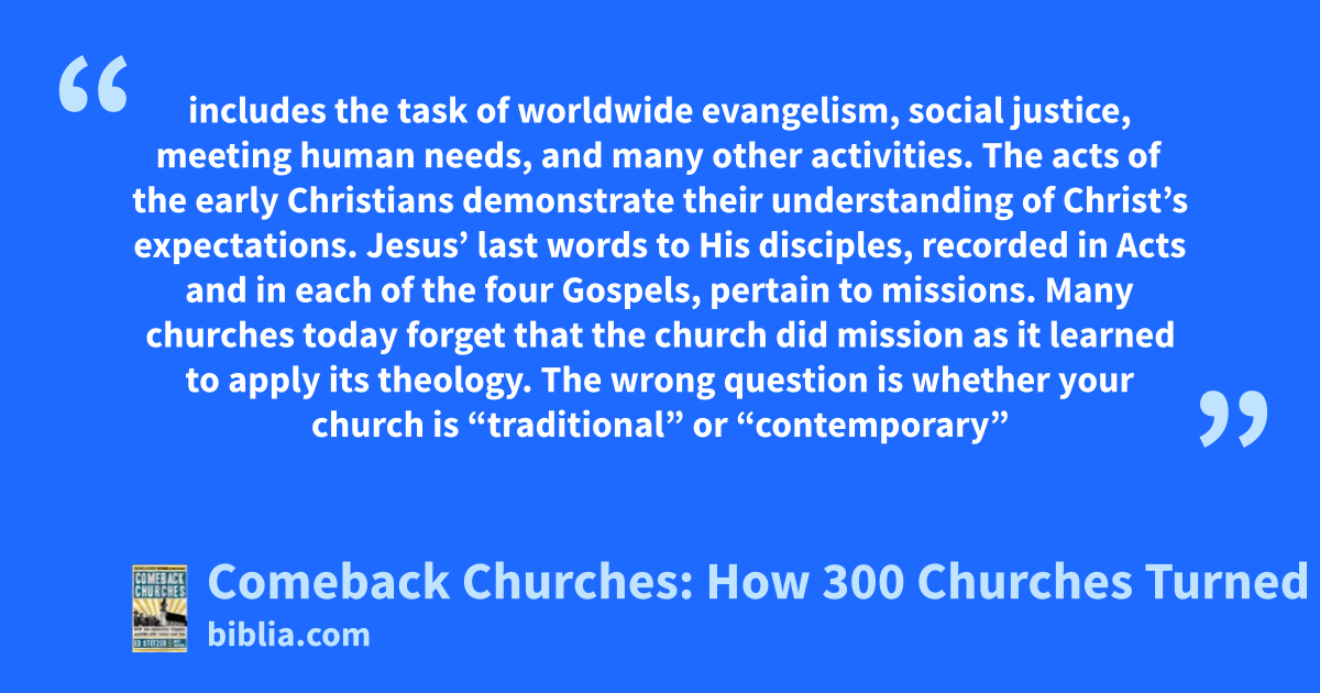 includes the task of worldwide evangelism, social justice, meeting human needs, and many other activities. The acts of the early Christians demonstrate their understanding of Christ’s expectations. Jesus’ last words to His disciples, recorded in Acts and in each of the four Gospels, pertain to missions. Many churches today forget that the church did mission as it learned to apply its theology. The wrong question is whether your church is “traditional” or “contemporary”
