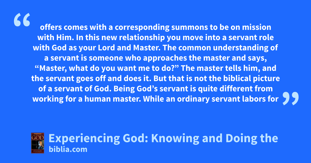 offers comes with a corresponding summons to be on mission with Him. In this new relationship you move into a servant role with God as your Lord and Master. The common understanding of a servant is someone who approaches the master and says, “Master, what do you want me to do?” The master tells him, and the servant goes off and does it. But that is not the biblical picture of a servant of God. Being God’s servant is quite different from working for a human master. While an ordinary servant labors for