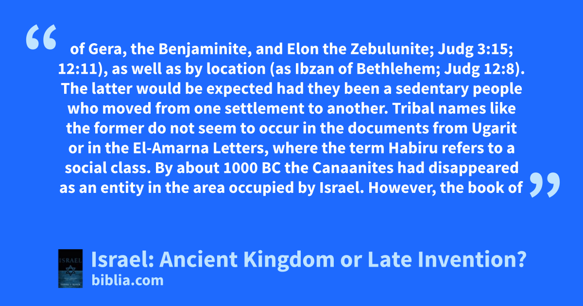 of Gera, the Benjaminite, and Elon the Zebulunite; Judg 3:15; 12:11), as well as by location (as Ibzan of Bethlehem; Judg 12:8). The latter would be expected had they been a sedentary people who moved from one settlement to another. Tribal names like the former do not seem to occur in the documents from Ugarit or in the El-Amarna Letters, where the term Habiru refers to a social class. By about 1000 BC the Canaanites had disappeared as an entity in the area occupied by Israel. However, the book of