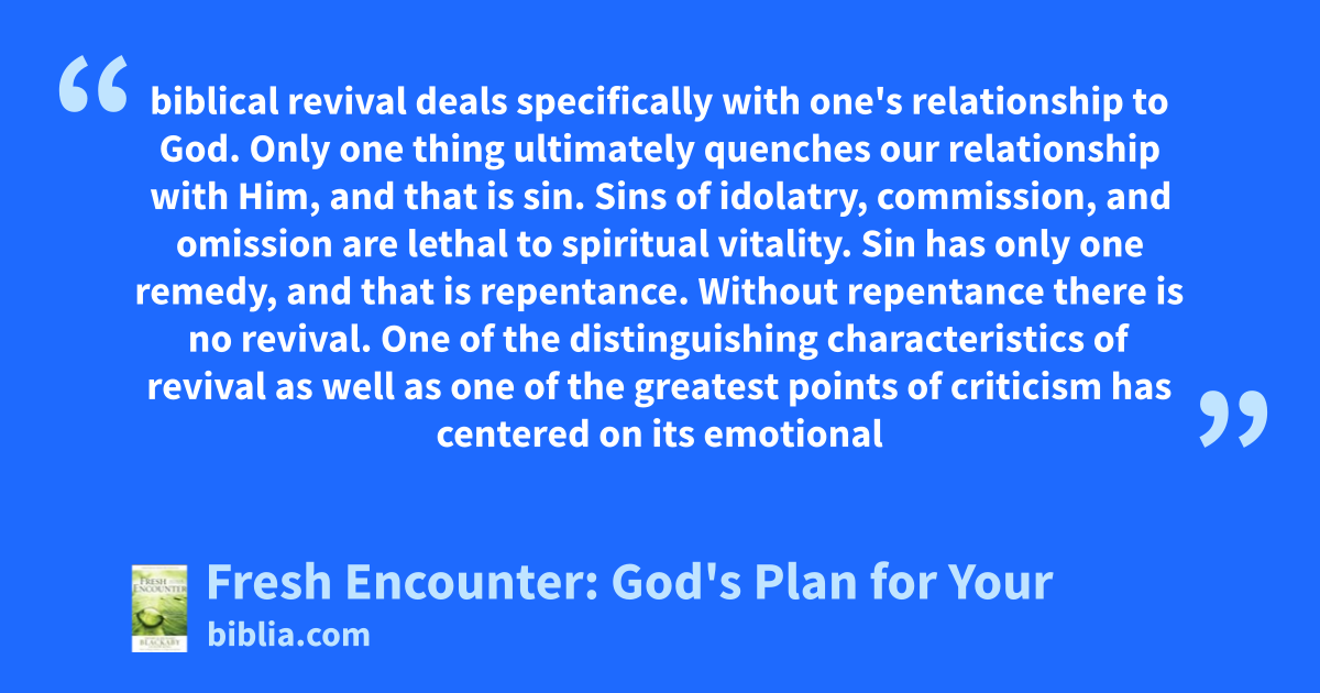 biblical revival deals specifically with one's relationship to God. Only one thing ultimately quenches our relationship with Him, and that is sin. Sins of idolatry, commission, and omission are lethal to spiritual vitality. Sin has only one remedy, and that is repentance. Without repentance there is no revival. One of the distinguishing characteristics of revival as well as one of the greatest points of criticism has centered on its emotional