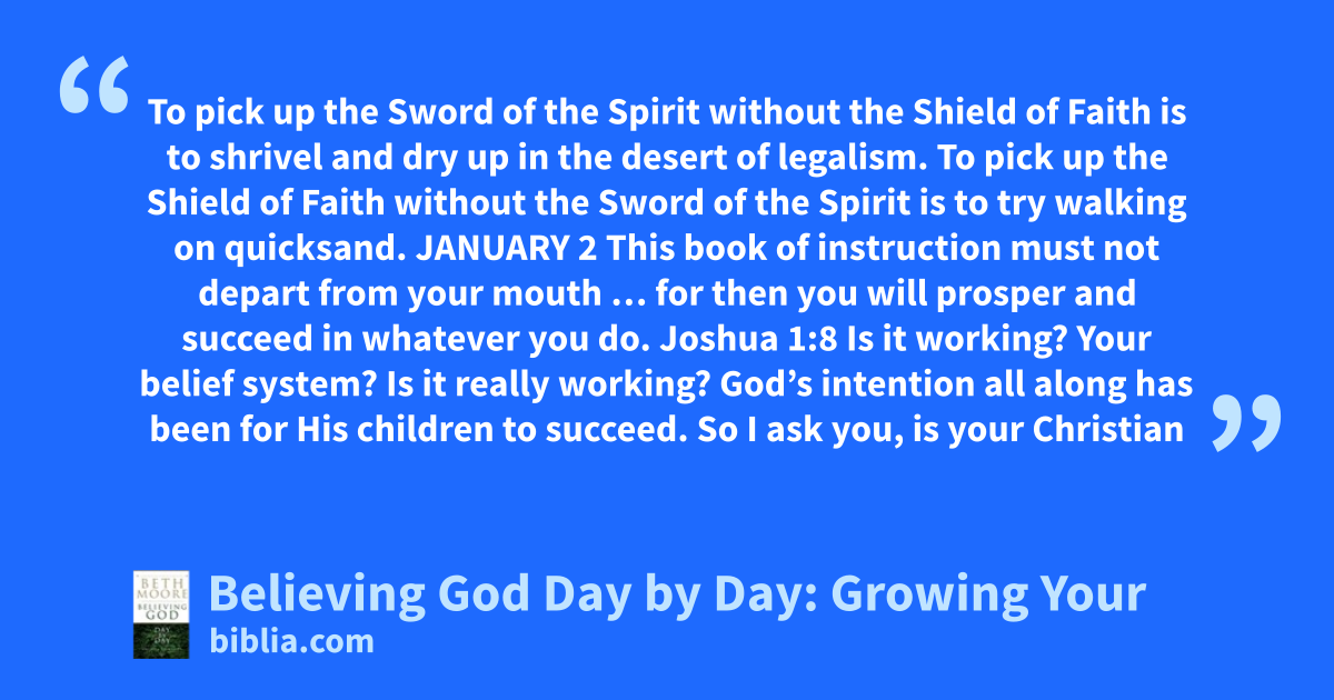 To pick up the Sword of the Spirit without the Shield of Faith is to shrivel and dry up in the desert of legalism. To pick up the Shield of Faith without the Sword of the Spirit is to try walking on quicksand. JANUARY 2 This book of instruction must not depart from your mouth … for then you will prosper and succeed in whatever you do. Joshua 1:8 Is it working? Your belief system? Is it really working? God’s intention all along has been for His children to succeed. So I ask you, is your Christian