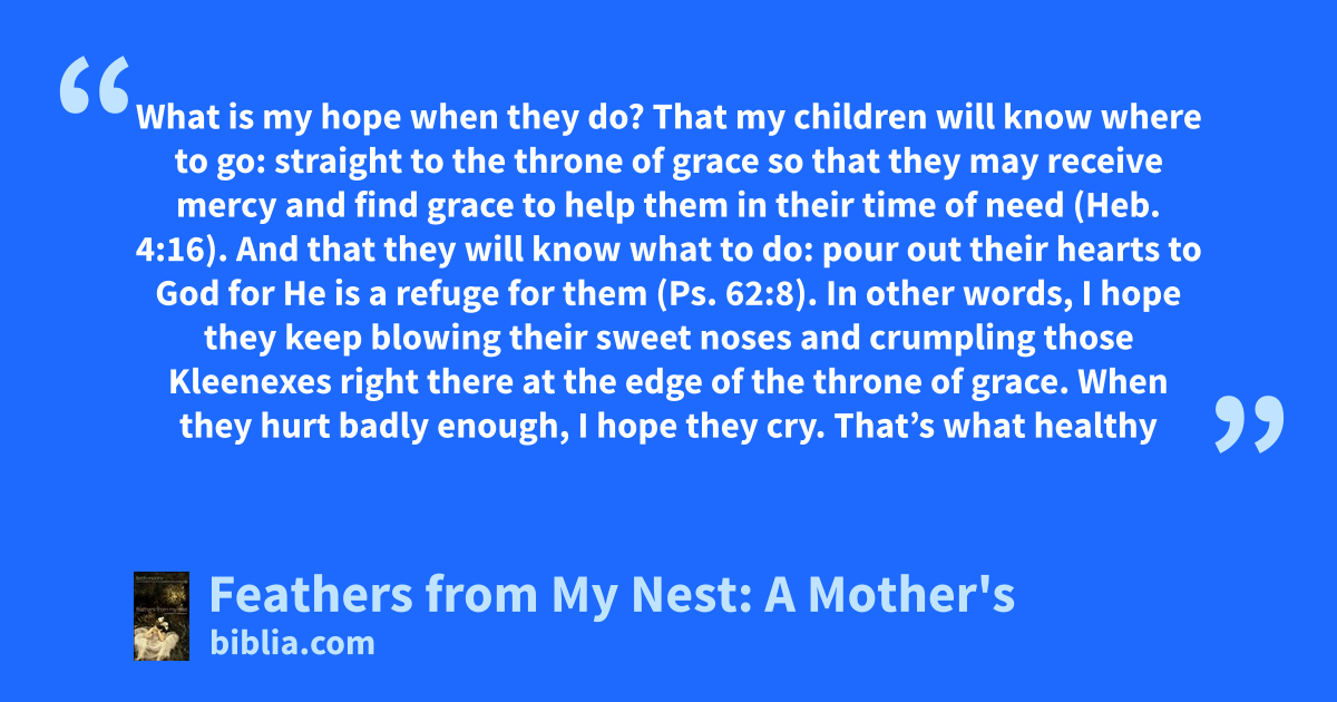 What is my hope when they do? That my children will know where to go: straight to the throne of grace so that they may receive mercy and find grace to help them in their time of need (Heb. 4:16). And that they will know what to do: pour out their hearts to God for He is a refuge for them (Ps. 62:8). In other words, I hope they keep blowing their sweet noses and crumpling those Kleenexes right there at the edge of the throne of grace. When they hurt badly enough, I hope they cry. That’s what healthy