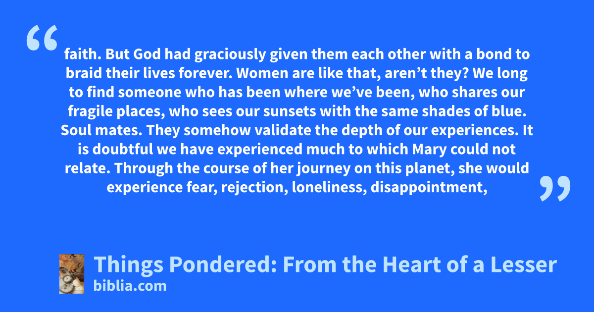 faith. But God had graciously given them each other with a bond to braid their lives forever. Women are like that, aren’t they? We long to find someone who has been where we’ve been, who shares our fragile places, who sees our sunsets with the same shades of blue. Soul mates. They somehow validate the depth of our experiences. It is doubtful we have experienced much to which Mary could not relate. Through the course of her journey on this planet, she would experience fear, rejection, loneliness, disappointment,
