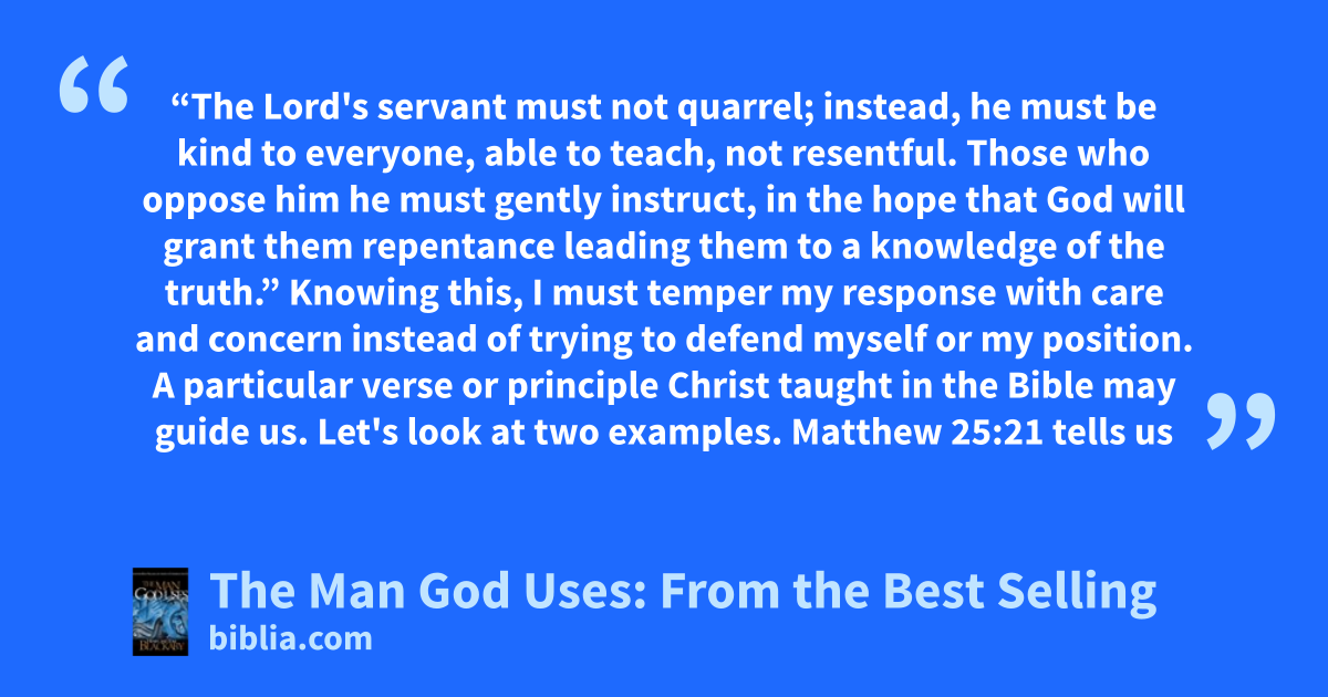 “The Lord's servant must not quarrel; instead, he must be kind to everyone, able to teach, not resentful. Those who oppose him he must gently instruct, in the hope that God will grant them repentance leading them to a knowledge of the truth.” Knowing this, I must temper my response with care and concern instead of trying to defend myself or my position. A particular verse or principle Christ taught in the Bible may guide us. Let's look at two examples. Matthew 25:21 tells us