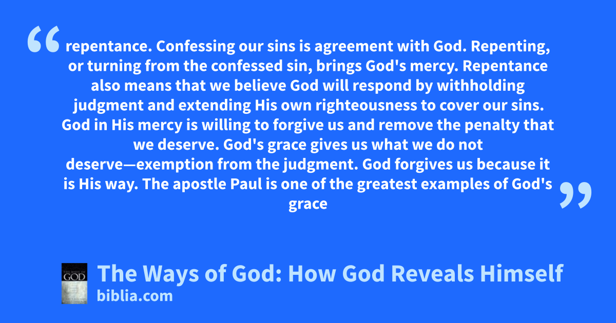repentance. Confessing our sins is agreement with God. Repenting, or turning from the confessed sin, brings God's mercy. Repentance also means that we believe God will respond by withholding judgment and extending His own righteousness to cover our sins. God in His mercy is willing to forgive us and remove the penalty that we deserve. God's grace gives us what we do not deserve—exemption from the judgment. God forgives us because it is His way. The apostle Paul is one of the greatest examples of God's grace