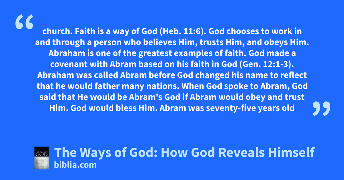 church. Faith is a way of God (Heb. 11:6). God chooses to work in and through a person who believes Him, trusts Him, and obeys Him. Abraham is one of the greatest examples of faith. God made a covenant with Abram based on his faith in God (Gen. 12:1-3). Abraham was called Abram before God changed his name to reflect that he would father many nations. When God spoke to Abram, God said that He would be Abram's God if Abram would obey and trust Him. God would bless Him. Abram was seventy-five years old