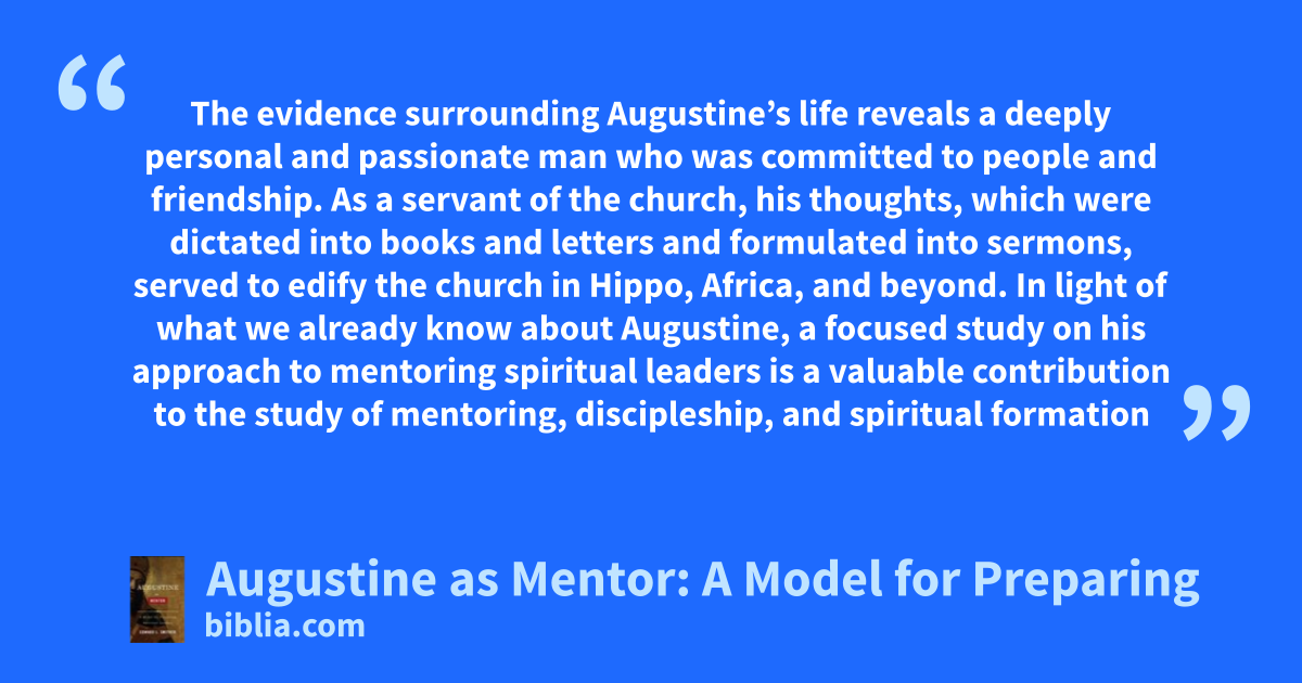 The evidence surrounding Augustine’s life reveals a deeply personal and passionate man who was committed to people and friendship. As a servant of the church, his thoughts, which were dictated into books and letters and formulated into sermons, served to edify the church in Hippo, Africa, and beyond. In light of what we already know about Augustine, a focused study on his approach to mentoring spiritual leaders is a valuable contribution to the study of mentoring, discipleship, and spiritual formation