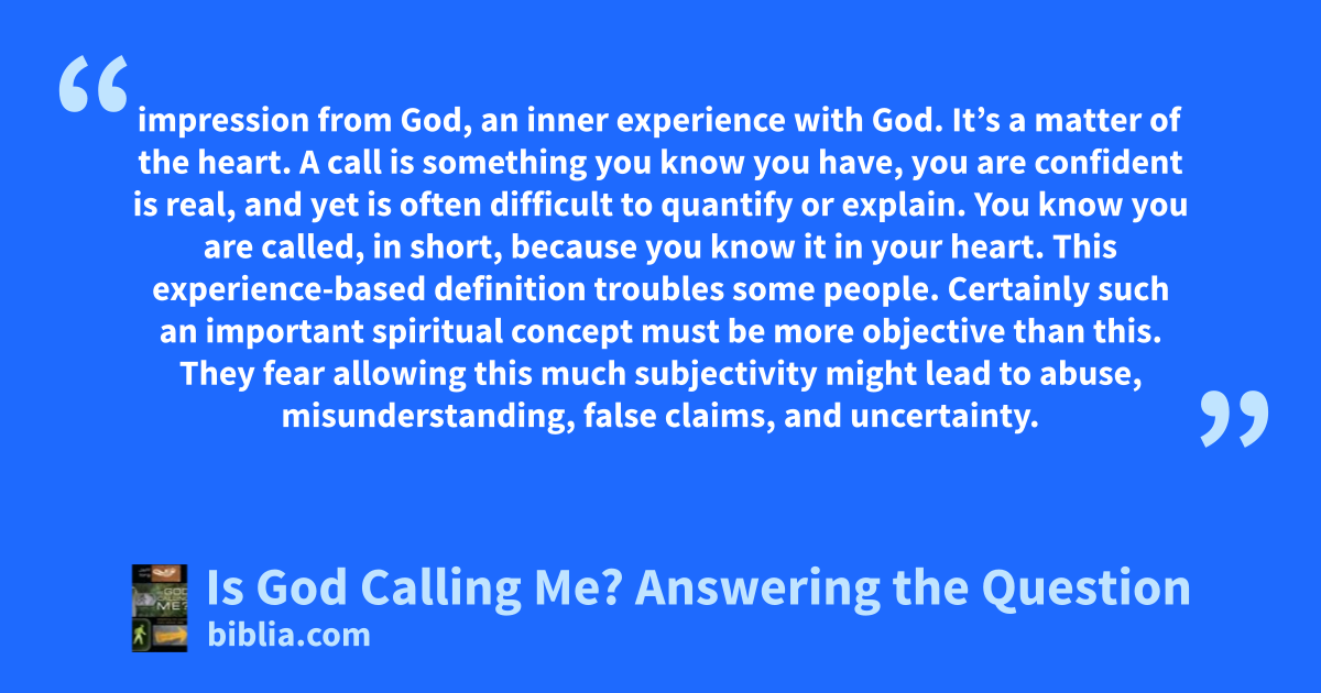 impression from God, an inner experience with God. It’s a matter of the heart. A call is something you know you have, you are confident is real, and yet is often difficult to quantify or explain. You know you are called, in short, because you know it in your heart. This experience-based definition troubles some people. Certainly such an important spiritual concept must be more objective than this. They fear allowing this much subjectivity might lead to abuse, misunderstanding, false claims, and uncertainty.