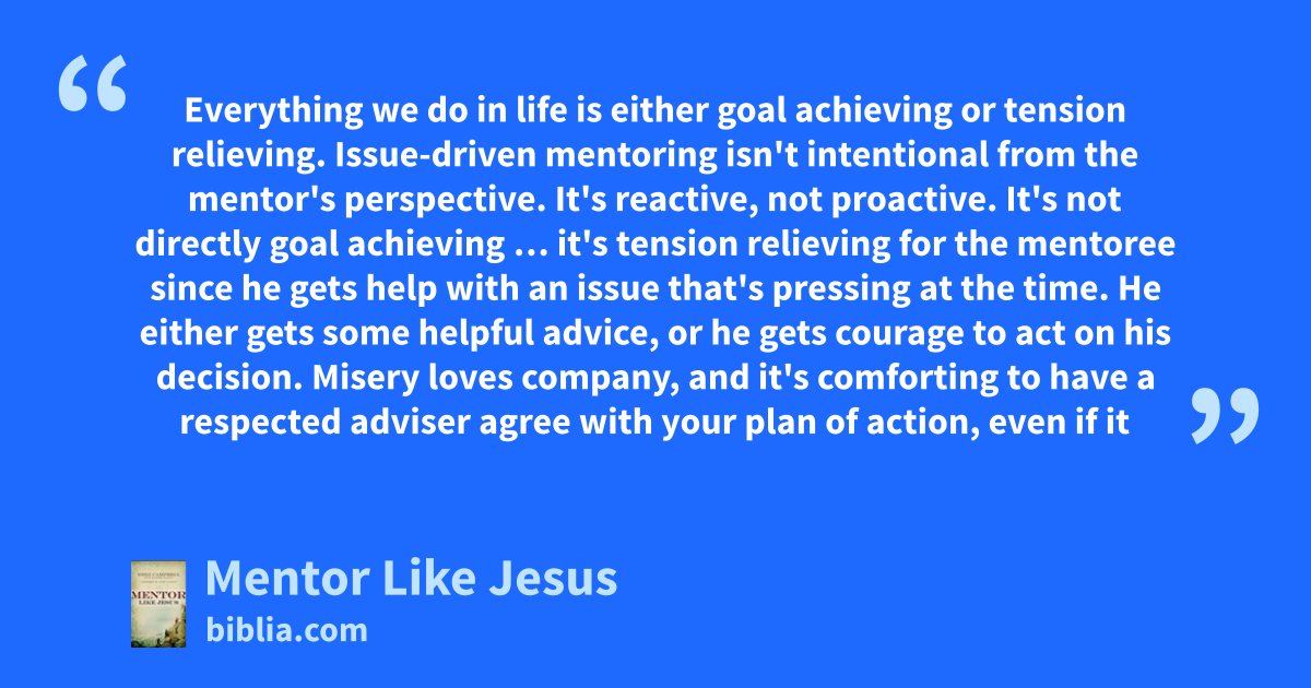 Everything we do in life is either goal achieving or tension relieving. Issue-driven mentoring isn't intentional from the mentor's perspective. It's reactive, not proactive. It's not directly goal achieving … it's tension relieving for the mentoree since he gets help with an issue that's pressing at the time. He either gets some helpful advice, or he gets courage to act on his decision. Misery loves company, and it's comforting to have a respected adviser agree with your plan of action, even if it