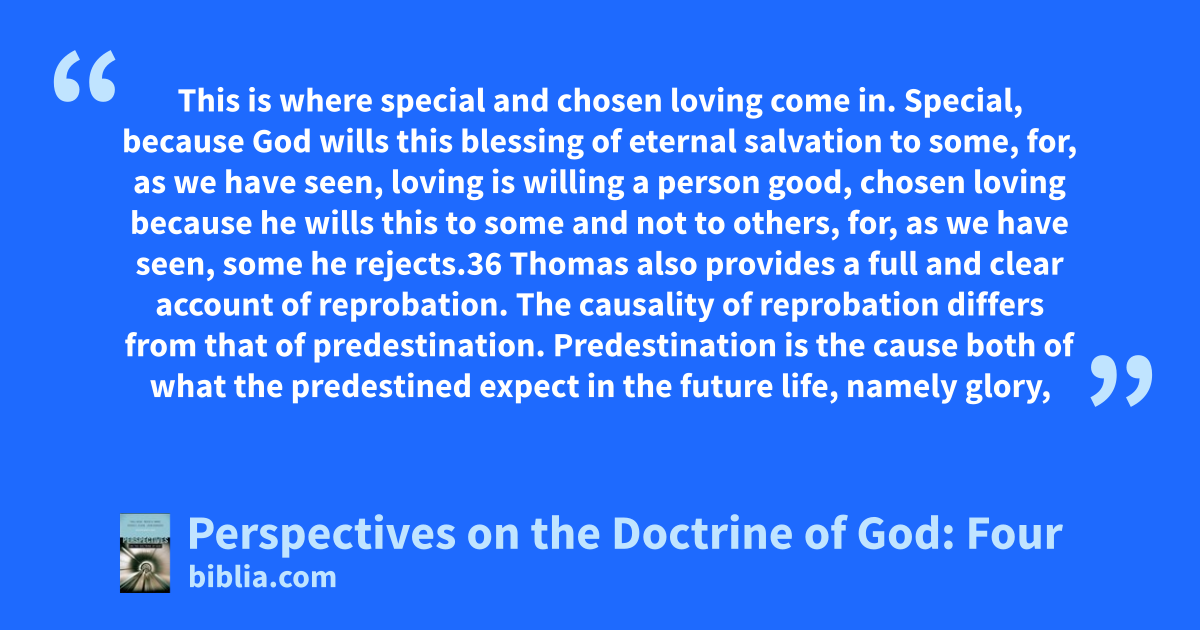 This is where special and chosen loving come in. Special, because God wills this blessing of eternal salvation to some, for, as we have seen, loving is willing a person good, chosen loving because he wills this to some and not to others, for, as we have seen, some he rejects.36 Thomas also provides a full and clear account of reprobation. The causality of reprobation differs from that of predestination. Predestination is the cause both of what the predestined expect in the future life, namely glory,