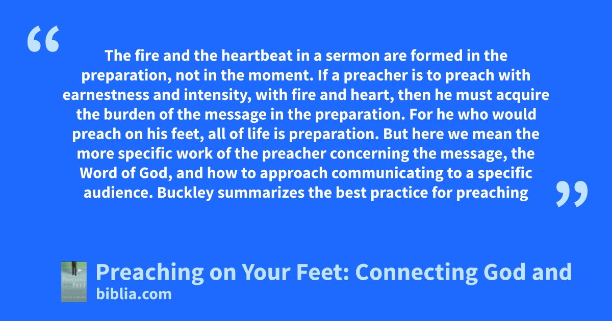 The fire and the heartbeat in a sermon are formed in the preparation, not in the moment. If a preacher is to preach with earnestness and intensity, with fire and heart, then he must acquire the burden of the message in the preparation. For he who would preach on his feet, all of life is preparation. But here we mean the more specific work of the preacher concerning the message, the Word of God, and how to approach communicating to a specific audience. Buckley summarizes the best practice for preaching