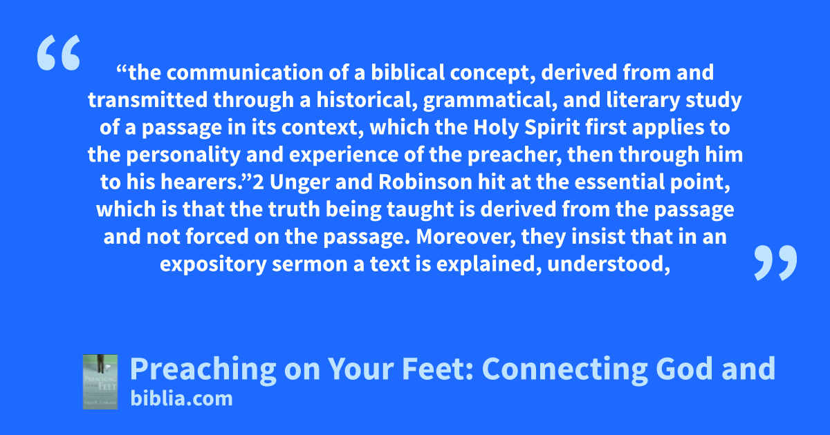 “the communication of a biblical concept, derived from and transmitted through a historical, grammatical, and literary study of a passage in its context, which the Holy Spirit first applies to the personality and experience of the preacher, then through him to his hearers.”2 Unger and Robinson hit at the essential point, which is that the truth being taught is derived from the passage and not forced on the passage. Moreover, they insist that in an expository sermon a text is explained, understood,