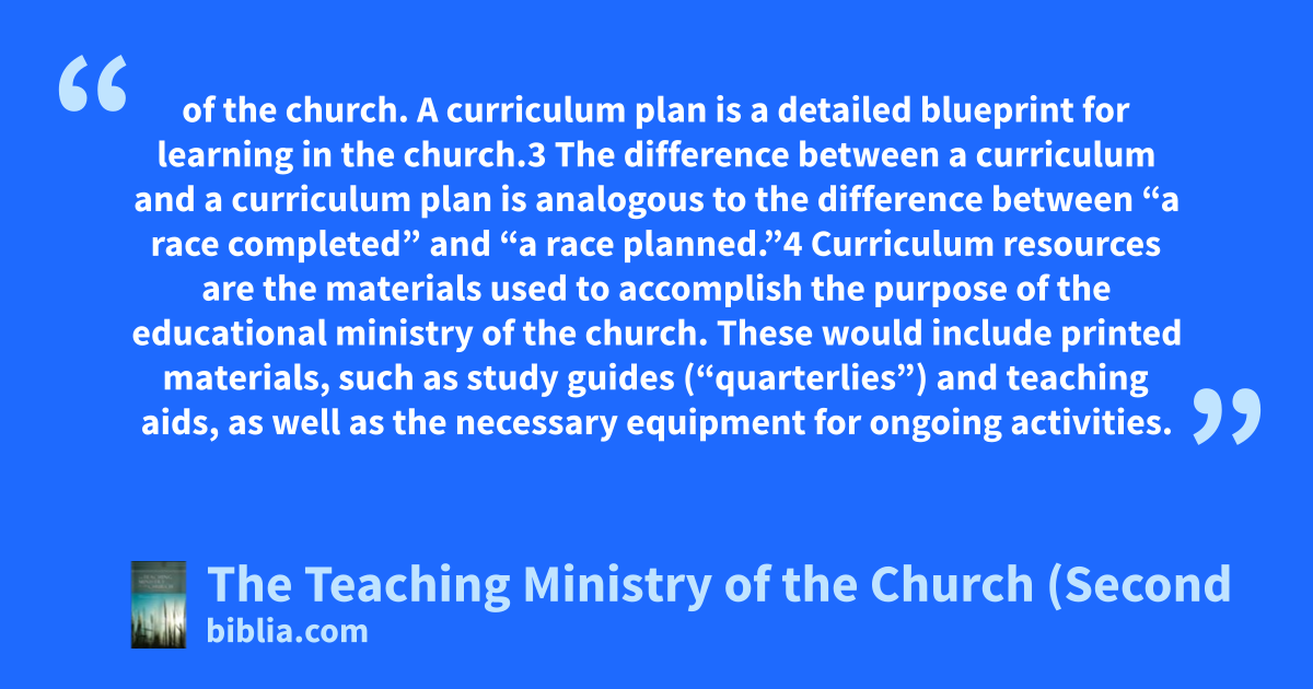 of the church. A curriculum plan is a detailed blueprint for learning in the church.3 The difference between a curriculum and a curriculum plan is analogous to the difference between “a race completed” and “a race planned.”4 Curriculum resources are the materials used to accomplish the purpose of the educational ministry of the church. These would include printed materials, such as study guides (“quarterlies”) and teaching aids, as well as the necessary equipment for ongoing activities.