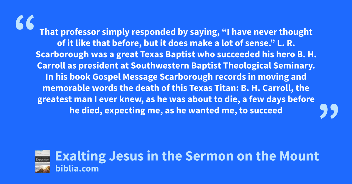That professor simply responded by saying, “I have never thought of it like that before, but it does make a lot of sense.” L. R. Scarborough was a great Texas Baptist who succeeded his hero B. H. Carroll as president at Southwestern Baptist Theological Seminary. In his book Gospel Message Scarborough records in moving and memorable words the death of this Texas Titan: B. H. Carroll, the greatest man I ever knew, as he was about to die, a few days before he died, expecting me, as he wanted me, to succeed
