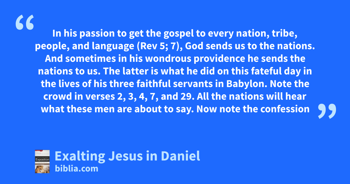 In his passion to get the gospel to every nation, tribe, people, and language (Rev 5; 7), God sends us to the nations. And sometimes in his wondrous providence he sends the nations to us. The latter is what he did on this fateful day in the lives of his three faithful servants in Babylon. Note the crowd in verses 2, 3, 4, 7, and 29. All the nations will hear what these men are about to say. Now note the confession