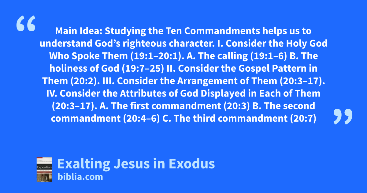 Main Idea: Studying the Ten Commandments helps us to understand God’s righteous character. I. Consider the Holy God Who Spoke Them (19:1–20:1). A. The calling (19:1–6) B. The holiness of God (19:7–25) II. Consider the Gospel Pattern in Them (20:2). III. Consider the Arrangement of Them (20:3–17). IV. Consider the Attributes of God Displayed in Each of Them (20:3–17). A. The first commandment (20:3) B. The second commandment (20:4–6) C. The third commandment (20:7)